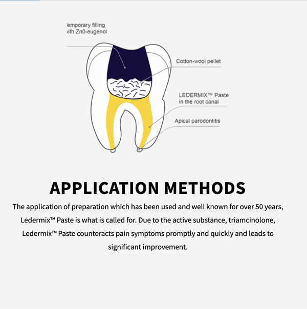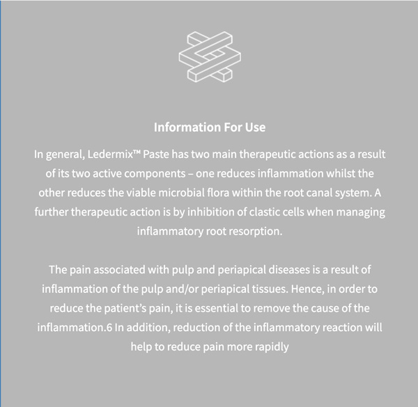 • Ledermix™ Paste can also be used as a pulpotomy agent in the emergency management of acute irreversible pulpitis5,6 - in these cases, it should only be used as an interim pain relief measure that must be followed by more comprehensive treatment such as pulpectomy and root canal therapy.