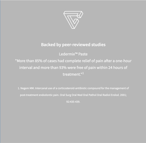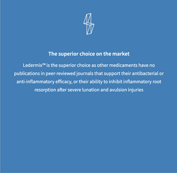 Ledermix is the only clinically proven product that has a long history of effective root canal management. It is essential for dental professionals who want to reduce the pain for their patients and be known for providing a service using reliable, superior products that are globally endorsed.  Australian made product!