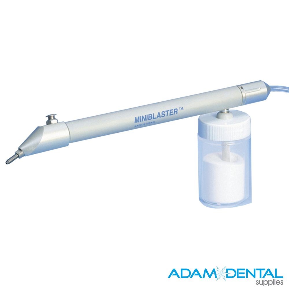 The MiniBlaster is indicated for the preparation of intra-oral surfaces prior to composite restorations and porcelain repairs and extra-oral surfaces prior to adhesive bonding procedures such as the removal of residual cement from crowns, bridges, orthodontic bands and brackets, for roughening metal/porcelain surfaces, and for etching endodontic posts. It is designed to simultaneously deliver a narrow stream of abrasive powder and air to enhance adhesive procedures by increasing the micro-retention of bonding surfaces. Hook-up options are available as are a range of special adaptors that enable the Miniblaster™ to be connected to and activated through the standard dental turbine hose.